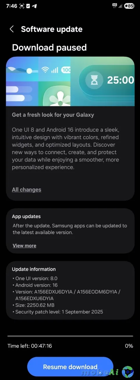 التحديث الجديد بييجي برقم إصدار A156EDXU6DYIA، وده تاني تحديث رئيسي للنظام بعد ما الهاتف كان نزل في الأساس بأندرويد 14، واستقبل تحديث One UI 7 في فبراير اللي فات.