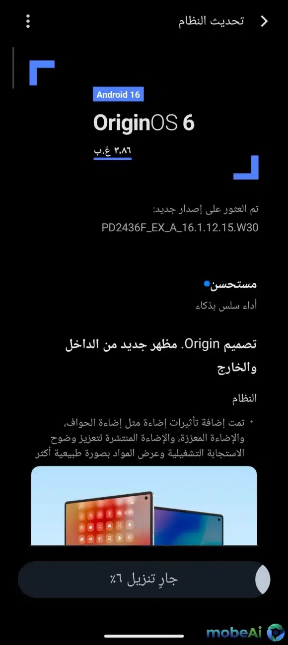 تحديث OriginOS 6 لهاتف Vivo X Fold 5 بيتوفر بالإصدار اللي نهايته PD2436F_EX_A_16.1.12.15.W30. بما إن ده تحديث رئيسي بيبني على Android 16، فحجم التحميل تقريبًا حوالي 4 جيجابايت — فمهم تحمل التحديث على شبكة واي فاي وتتأكد إن عندك مساحة كافية.